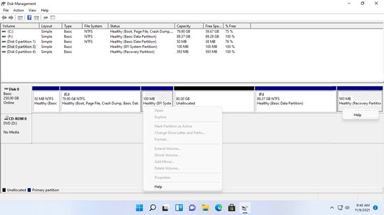 In der nativen Windows 11/10-Datenträgerverwaltung wird für die EFI-Partition kein Dateisystem angezeigt. Alle nützlichen Operationen sind ausgegraut. Für die Wiederherstellungspartition wird kein Laufwerksbuchstabe oder Dateisystem angezeigt, es gibt nur die Hilfe-Option in der Datenträgerverwaltung.