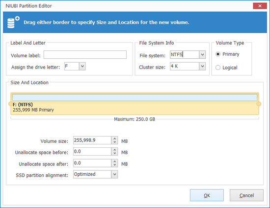 If you want to create more volumes, right click the Unallocated space and select "Create Volume". You can select partition type, file system, cluster size, add/modify partition label, change drive letter and edit partition size/location in the pop-up window.